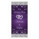 This romantic purple and silver grey floral wedding menu card has an image of a pair of joined hearts overtop a purple ribbon image running across the width of the card. There is a simulated silver border at the top and bottom of the menu with a dark purple text area on the front that has the names of the bride and groom, and the wedding date in grey below the ribbon, with "Our Wedding Menu" in grey above the ribbon. The back is grey with purple flowers arched over the menu details in purple. If you need any additional matching items, please email your request to niteowlstudio@gmail.com or use the Zazzle chat feature to get in touch.
