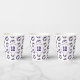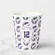 These volleyball themed birthday party paper cups feature multiple small purple, grey & white volleyballs arranged in a simple drop pattern - text on a white circle graphic can be customised, currently 12 to represent a child's age encircled by the words, "Happy birthday" - by katz_d_zynes