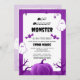 This playful baby shower design features a cute Halloween monster theme with purple accents, friendly ghosts, bats, pumpkins, and subtle spooky details. The clean white layout combined with festive illustrations creates a fun yet balanced celebration aesthetic. Bold typography adds personality while keeping the design easy to read. Fully editable text allows flexible customization, making this design ideal for seasonal baby shower themes with a charming little monster vibe.