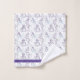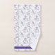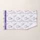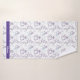 Colours of purple and light blue are used in making this snowman seamless bath towel set. Hand drawn illustration of a cute snowman with top hat, scarf, and carrot nose. He stands on a hill of snow near a Christmas tree with a star. "Merry Christmas!" text is included in pattern on a purple and white stripe banner.