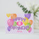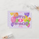 This fun and colourful birthday card for a girl is downloadable and features the message "Happy Birthday" spelled out in realistic, whimsically arranged purple frosted cutout cookies on the front of the card surrounded by multicolor balloons - message on back and child's age and name can be personalised - two balloon-shaped cutout cookies accent the back of the card - background is a pattern of small white polka dots on pale purple - by katz_d_zynes
