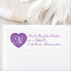 Chic wedding return address labels, done in white, with a purple glittery looking heart, on the left side, with a white one letter monogram. Personalise the purple text and monogram, to suit your needs.