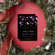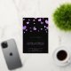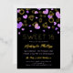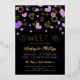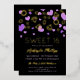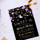 Purple and gold Sweet 16 celebration invitation in black with purple hearts and gold foil outlines of gemstones. Glam sweet 16 party invitation in purple, black, and gold. Girly sweet sixteen invitation with gold foil and purple text, purple hearts, and golden gems.