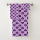 This bath towel set features a classic pattern of two-tone purple hearts on a lavender background.