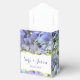 This wedding favour tent box with white ribbon features a photograph of full bloom purple hydrangeas. A white bracket shaped box on the front under the flap features customisable text for the names of the bride and groom and their wedding date.