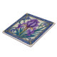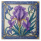 A purple iris flower with yellow accents, surrounded by green leaves and a blue floral border, art nouveau style, intricate details, vibrant colours, elegant design.