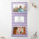Purple joy and berries Christmas holiday trifold photo card. The cover showcases the word "JOY" with red berries and greenery while instead of the letter "O" there is your photo. The inside first and last panels as well as the ourside flap feature a pattern of purple and white stripes and snow that form frames for your photos. The inside middle panel displays a frame with your wishes accented with red berries and greenery. Some photos are of Photography © Storytree Studios, Stanford, CA