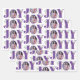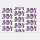 Purple Joy with berries Christmas holiday photo Wrapping Paper Sheets. It showcases a pattern of the word "JOY" in purple with red berries and greenery while instead of the letter "O" there is your photo.