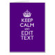 Your personalised Keep Calm saying on a fine custom deep purple colour style decor. A personalised Keep Calm style saying on a one of a kind gift. Humourous or whimsical try on your creative words on two editable lines of text. Remember to use CAPITAL letters for best results.