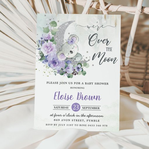 Purple Koala We're Over the Moon Girl Baby Shower Water Bottle Label