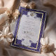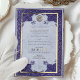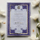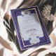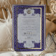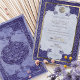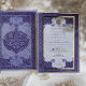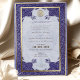 This exquisite wedding invitation captures the essence of traditional Muslim matrimony with its elegant lace design in a purple hue. The delicate intricacies of the border frame the page, leading the eye to the sacred Islamic calligraphy at the centre top. The aged parchment-like background provides a vintage feel, while the ornate details around the edges resonate with the grandeur of classic Muslim art. The rich colour palette of lavender, with accents of purple and cold white, evokes the feeling of a starry night, perfect for an evening of celebration. This invitation is not only a herald of the upcoming nuptials but also a keepsake of cultural beauty and significance.