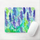 A floral mouse pad decorated with a garden of blooming lavender flowers painted with watercolor in a variety of shades of blue, purple, and green.