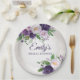 Beautiful plum purple and soft lavender watercolor floral and greenery on botanical white bridal shower paper plates. Personalised with the name of the bride-to-be. All text is customisable, so add or remove as you wish. Contact us for help with customisation or matching products.