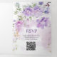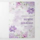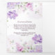 The trifold invitation features a soft, watercolor-style floral design. Clusters of delicate flowers in shades of purple, lavender, and pink bloom across the top and bottom, interwoven with pale green leaves and subtle branches. The layout creates a gentle, natural frame around the centre, drawing attention inward while keeping a light, elegant aesthetic throughout. The colour palette feels romantic and fresh—perfect for a spring or summer celebration.