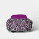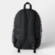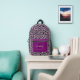 This personalised backpack features a pattern of purple and black leopard spots on a white background. Add a monogram and first name in modern black and white script to the purple pocket, with the full name below in white sans serif font. Ideal for back to school!