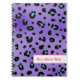 A spiral notebook featuring a purple leopard print design. Personalise with your name in pink.
