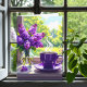 A gorgeous floral birthday card for your niece. A lovely ai illustration of a vase of purple lilacs in a glass vase and a warm cup of coffee sitting on a window sill.