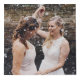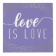 Photo cube with room for four of your wedding photos, with love is love written on a purple background decorated with faux gold confetti.