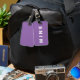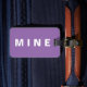 Purple luggage tag with 'Mine' written on it