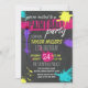 Cool paintball party invitation with paint spatter against a dark background in purple, hot pink, yellow, and turquoise.