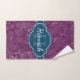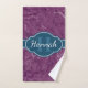 Stylish, trendy dark and light purple marble pattern in the background, topped with a white and teal blue label featuring a customisable name and monogram template.