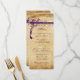 Vintage Mediaeval Renaissance Rustic Purple Elements on a distressed paper design Wedding Menu. farmhouse rustic country backyard barn, purple and caramel tan beige