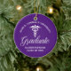 This classic purple custom medical school graduation keepsake Christmas ornament features white typography under a medical caduceus and your college name for a class of 2024 MD or RN. Add your photo on the back. Customise with your graduating year under the elegant calligraphy for a great personalised university graduate gift for a nurse or doctor.