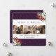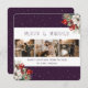 Elegant purple photo newlywed Christmas card featuring a star pattern on a dark purple background adorned with winter botanicals and 3 photos in the middle and a holiday phrase in a modern font above. Easily personalize this botanical Christmas card with your photos, text, and your family name.