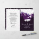 Purple mountains and conifers folded wedding program. A trendy yet elegant wedding design featuring a mountain range through conifers and your names in handwritten style. The inside includes dark purple and white borders with polka dots and white frames with your text.