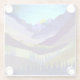 An abstract landscape with unique textures showing a purple and lavender mountain landscape with a stunning blue sky and flock of birds in shades of purple, lavender, beige, yellow, and pink.