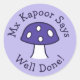 A purple cartoon mushroom. The text reads "Mx Kapoor Says Well Done!" and can be changed for a custom name/message. Ideal for teachers as rewards for students.