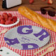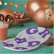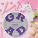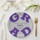 GRAD in bold purple lettering curves around the edges of these silver grey graduation party paper plates - available in 2 sizes. Congratulations above the name of your graduate and the Class of below. The perfect addition to your table decor for upcoming grad parties. **TIP: Click on CUSTOMIZE button; click on COLOR box on top right; enter your colour hex code in the #xxxxxx box to match your school colours. SEE ENTIRE COLLECTION of pre-done colour combinations and more in our store.