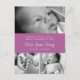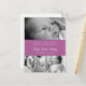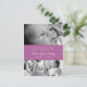 Three photos on the front with orchid purple band with birth details. Back has postcard layout with customisable message and square photograph. Click "customise it" to move or remove elements of the postcard that you don't want.