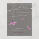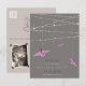 This modern zen wedding save the date announcement postcard features two origami purple paper cranes hanging from stylish minimalist strings of fairy lights against a dark grey background.