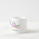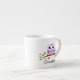 Cute, personalised espresso mug featuring an illustration of a little purple owl sitting on a branch with green leaves and pink flowers. Add a name or other short text. Cute and fun design for girls and women.