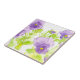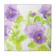 A pretty ceramic tile decorated with soft pastel watercolor pansies painted in shades of purple with spring green leaves.