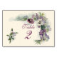 Part of a matching set of wedding stationery, a table number card with a vintage watercolor painting of mauve and purple pansy flowers, by 19th century artist Marie Low. The card is laid out with a formal script typeface in colours to match the illustration, giving an old fashioned elegant finish.