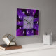 Designed with a rich purple and magenta fractal spiral bloom. The clock hands are set off with a purple marbled square frame with a light purple shadowed inset matting. Shiny purpple 3D look traditional numbers complete the look. Artwork and design by Karlajkitty