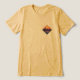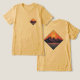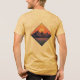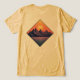 This digital illustration captures a serene mountain range framed within a diamond-shaped border. The scene depicts jagged, purple peaks set against a vibrant orange and pink sunset sky, with a large, golden sun partially visible behind the mountains. Below the range, a calm body of water reflects the warm hues of the sky, rendered with textured lines that suggest gentle ripples. The entire piece uses a monoline art style with a vintage color palette, making it suitable for use as a sticker, badge, or modern wall art.