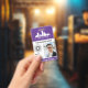 Vertical employee ID with a purple accent colour. Add photo, 2 logos, name, title, ID number and more for a professional looking employee ID badge. A practical and professional employee badge personalised with photo, one larger logo and one smaller logo, along with title, business name, and name.