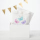 These baby shower favour bags feature a watercolor butterfly design with purple, pink and aqua butterflies, flowers and confetti dots. Matching baby shower products are also available in this collection.