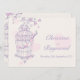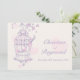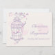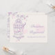 Cute bird couple in line art graphic drawing of open bird cage hanging from a blossoming spring tree with hearts. Fashionable modern chic wedding design part of the the bird cage romantic wedding stationary set. Pretty pastel shades purple and soft pink on a cream background colour. Edit this invitation with your own name, dates and words. Unique drawing and design by Sarah Trett.