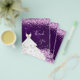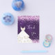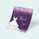 A feminine and elegant birthday thank you note. A purple, uneven coloured background colour. With pink faux glitter, sparkles and a white drerss. On front a large hand lettered script and the text: Thank You.