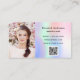 A trendy holographic background with unicorn colours and rainbow colours in pink, purple, rose gold, mint green. A faux gold frame on the front. Personalise and add your name, title, photo, phone number, mail, website address, qr code to your website.