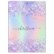 A trendy iridescent, holographic background with pastel colours in pink, purple, mint green. Decorated with faux sparkles. Purple coloured letters. Personalise and add your name. The name is written with a modern hand lettered style script with swashes. To keep the swashes only delete the sample name, leave the spaces or emoji's in front and after the name.