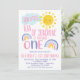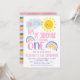 Sweet and colorful sunshine themed first birthday invitation featuring a cute sun, two rainbows, a cloud and some handwritten style text in mainly pink and purple. This our little ray of sunshine first birthday invitation is a cute way to invite guests to a baby girl's colorful sunshine themed first birthday party.
