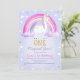 Girl's first birthday unicorn themed invitation featuring a unicorn, stars and a rainbow with clouds. This unicorn first birthday invitation a faux gold glitter word and is ideal for a unicorn themed first birthday party.