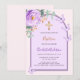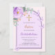 A blush pink background with an arch. Decorated with a purple, violet floral, rose flower, green watercolored eucalyptus greenery and butterflies. Personalise and add a name and details.