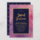 This elegant Sweet 16 invitation features purple pink watercolor, the words "Sweet Sixteen" and a border both in faux gold foil and a dark blue centre. Invitation has a faux gold foil polka dot pattern against a dark blue background backside. C