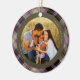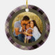 Rustic holiday ornament features a centre circular framed photo, with customised name and Merry Christmas in simple typography. This classic ornament features a traditional purple and olive plaid pattern.
